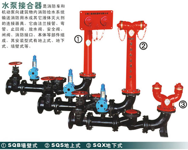 水泵接合器是根据“高层建筑防火规范”为高层建筑配套的消防设施。通常与建筑物内的自动喷水灭火系统或消火栓等消防设备的供水系统相连接。是连接消防车向室内消防给水系统加压供水的装置,一端有消防给水管网水平干管引出,另一端设于消防车易于接近的地方。当发生火灾时,消防车的水泵可迅速方便地通过该接合器的接口与建筑物内的消防设备相连接,并送水加压,从而使室内的消防设备得到充足的压力水源,用以扑灭不同楼层的火灾,有效地解决了建筑物发生火灾后,消防车灭火困难或因室内的消防设备因得不到充足的压力水源无法灭火的情况。