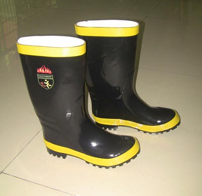 消防胶靴是消防员进入火场灭火时的脚部防护装备;胶靴底部内嵌钢板,具有防水和防穿刺功能,亦具备基本的隔热和绝缘功能。主要材料为橡胶、钢板。