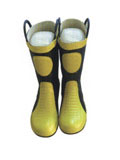 消防员灭火靴产品介绍: 符合GA6-2004《消防员灭火防靴》标准并符合以下要求: 手拎式,用于小腿部和足部防护。具备阻燃、防穿刺、防滑、防水、电绝缘、耐高温和低温、耐一般酸碱性能。 材料:橡胶帮面,橡胶靴底护靴;靴帮中加入防火隔毡,耐高温性好。国产优质抗老化橡胶成型,多层结构,靴头带钢头防砸(测试冲击力10.78KN),钢头两侧带绝缘橡胶层,靴底有钢中底防刺穿,抗穿刺性能≥1100(N). 电绝缘性能:击穿电压≥5000(V),泄漏电流<3毫安。靴底为特殊防滑设计, 靴主体为黑色配黄色。靴面无有起皱、砂眼、杂质、气泡、疙瘩硬粒、亮油擦伤现象。靴面与夹里布、内底布以及防砸内包头衬垫平整,无脱壳现象。无脱齿弹边、脱空、开胶、喷霜、过硫和欠硫现象。脚码符合国家标准要求。