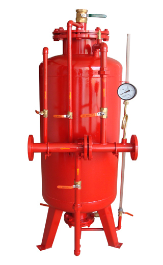 2、PHY贮罐内无胶囊式 整套设备由比例混合器、钢制贮罐、进水系、出液系、单向阀、安全阀、控制阀、压力表、排气系统及管道组成。 比例混合器可使水和泡沫液自动按一定比例混合。当消防水通过比例混合器时,一部分水通过“进水阀”管路进入贮罐腔,挤压泡沫液,因喷嘴前后微小的压差,使得泡沫液经吸液管被挤出与水混合成为泡沫混合液流,经空气泡沫产生器或其他喷射设备喷出泡沫进行灭火工作。 特点:贮罐内无胶囊,水进入罐内时,和泡沫液直接接触。每次使用后,罐内水和泡沫液应全部排掉,罐壁冲洗干净,吹干,再重新装满泡沫液,待用。不存在胶囊破裂而造成的损失。适用于能和金属罐直接接触泡沫液。